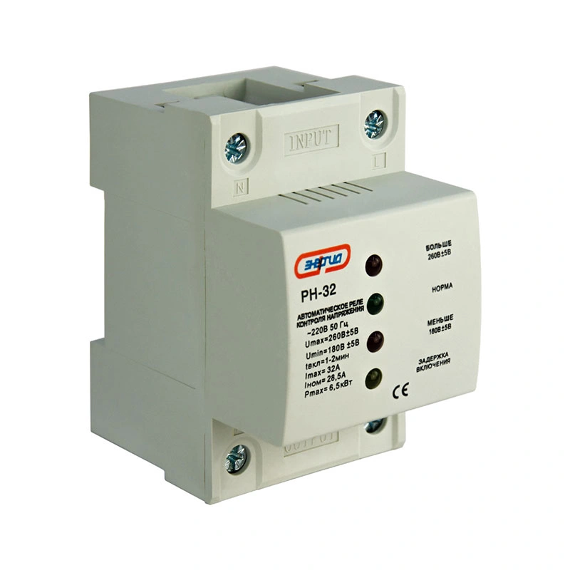 Установки срабатывания по напряжению и время срабатывания при достижении пороговых значений устанавливаются заводом-изготовителем на уровне: Umin 165–175В; Umax 260–270В; и t срабатывания от 1 до 6 сек. При включении в сеть, нагрузка включается с задержкой времени, равной времени повторного включения — 2-3 минуты (заводская установка). Реле имеет двухцветную световую индикацию наличия напряжения на входе. Светодиод горит зеленым цветом — допустимое напряжение на входе. При выходе параметров напряжения за допустимые рамки происходит срабатывание реле, отключается нагрузка и светодиод переключается на красный цвет.
