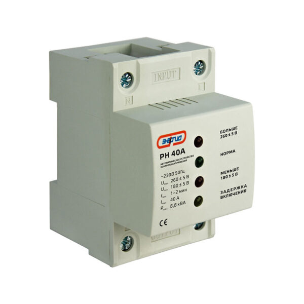 Установки срабатывания по напряжению и время срабатывания при достижении пороговых значений устанавливаются заводом-изготовителем на уровне: Umin 165–175В; Umax 260–270В; и t срабатывания от 1 до 6 сек. При включении в сеть, нагрузка включается с задержкой времени, равной времени повторного включения — 2-3 минуты (заводская установка). Реле имеет двухцветную световую индикацию наличия напряжения на входе. Светодиод горит зеленым цветом — допустимое напряжение на входе. При выходе параметров напряжения за допустимые рамки происходит срабатывание реле, отключается нагрузка и светодиод переключается на красный цвет.
