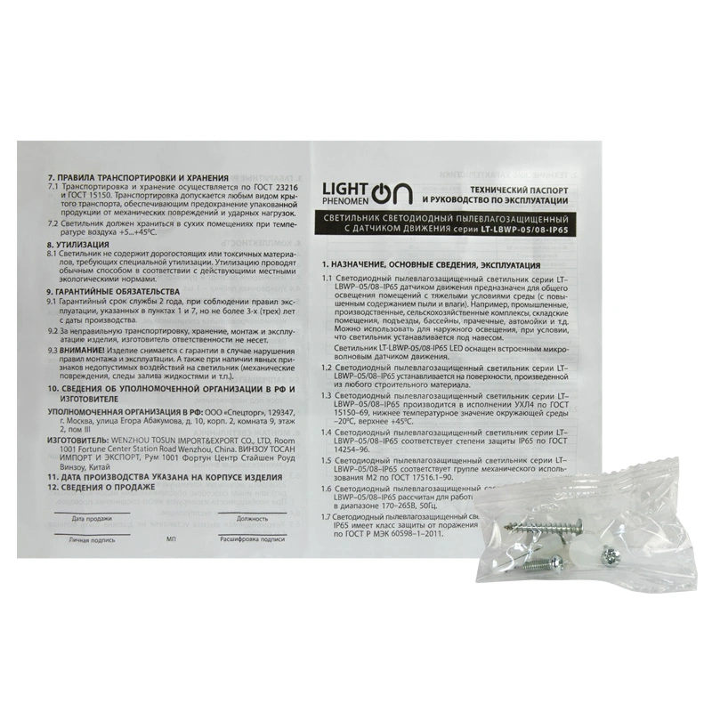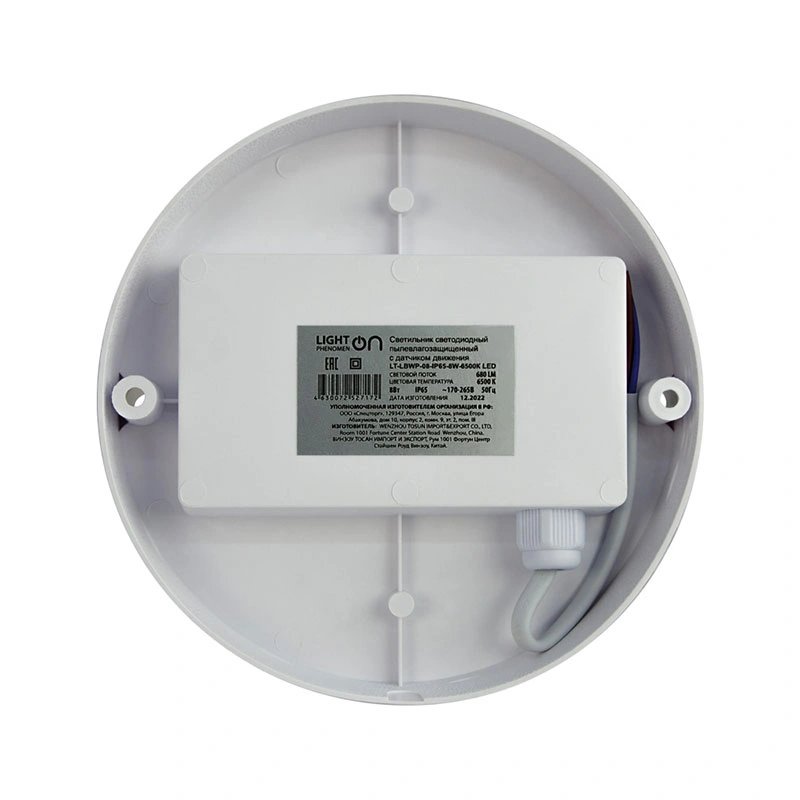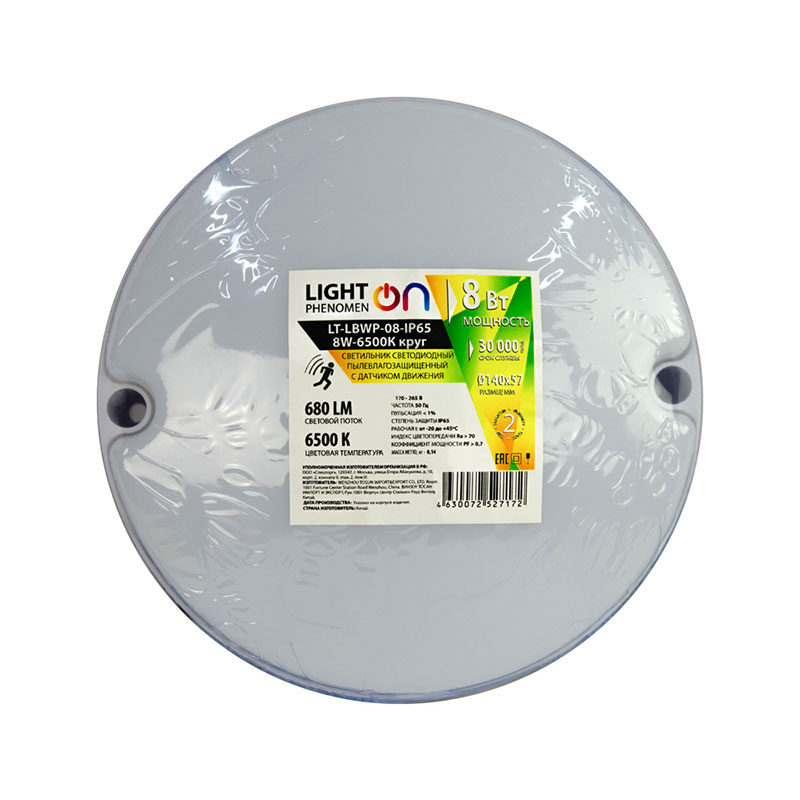 В светильнике LT-LBWP-05/08-IP65 LED установлен фотоэлемент, включающий светильник при освещении менее 20 Люкс, и датчик движения.