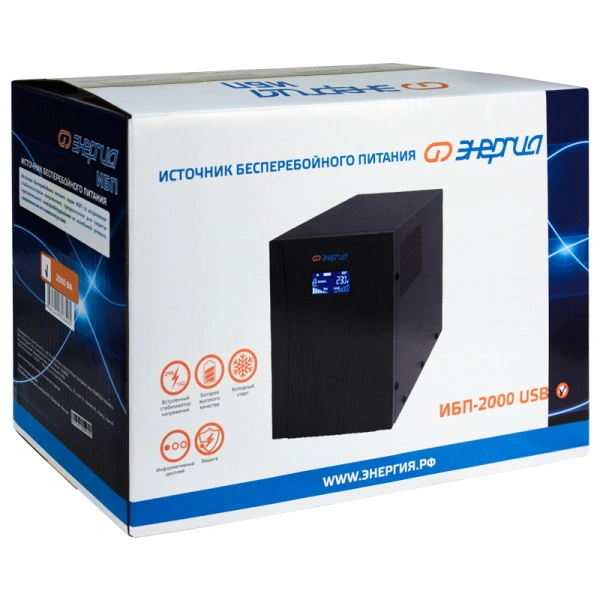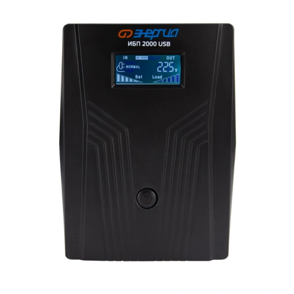 Источник бесперебойного питания 2000 LCD USB Энергия обеспечивает резервное электропитание оборудования при отключении электроэнергии. Модель оснащена LCD-экраном, который отображает уровень заряда аккумулятора и основные параметры сети.