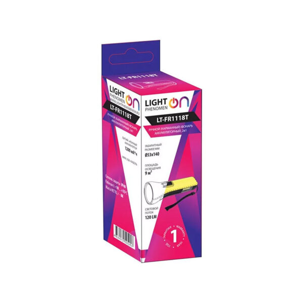 Тип питания: литий–ионный аккумулятор (входит в комплект) Емкость: 400 мА*ч Напряжение DC: 3,7 вольт Макс. освещенность (рассеянный свет): 70 лм Площадь освещения (рассеянный свет): до 9 м2 Суммарная мощность светодиодов: 1 Вт Макс. освещенность (направленный луч): до 120 лм Длина луча (направленный луч): до 40 м Суммарная мощность светодиодов (направленный луч): 3 Вт Время работы: до 4 ч Диапазон рабочих температур: –10 … +35 °С Степень защиты от пыли и влаги: IP40 (защита от крупной пыли, песка и т.п.) Габаритные размеры изделия: Ø 53 х 140 мм Вес нетто изделия: 88 г Гарантия: 12 мес.
