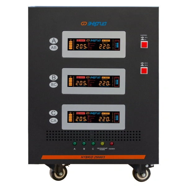 Основная задача стабилизатора напряжения Энергия серии Hybrid II поколения — обеспечить бесперебойное и качественное электропитание для широкого спектра оборудования в условиях нестабильных сетей. Он эффективно защищает подключенные устройства не только от длительных и значительных отклонений напряжения от нормы, но и от кратковременных высоковольтных импульсов и высокочастотных помех. Аппарат использует комбинированный метод регулировки, который переключается между релейным и сервоприводным (электромеханическим) принципами в зависимости от уровня входного напряжения.