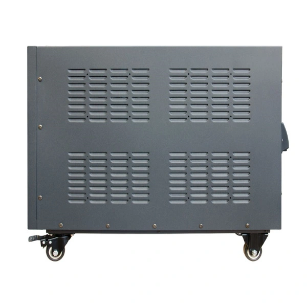 Корпус стабилизатора выполнен в виде цельного металлического каркаса, оснащённого транспортировочными колёсами для удобства перемещения. Такая конструкция свидетельствует о качественной сборке и повышенной прочности.