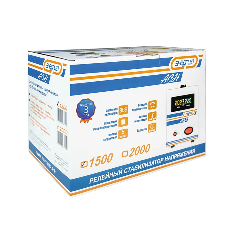 Релейный однофазный стабилизатор напряжения переменного тока предназначен для стабилизации переменного напряжения в сети электроснабжения для потребителей бытового и аналогичного назначения. Изделие относится к классу автотрансформаторных стабилизаторов со ступенчатым регулированием напряжения путем переключения отводов силового автотрансформатора с помощью электромеханических силовых реле, таким образом стабилизаторы Энергия АСН регулируют напряжение по релейному принципу.