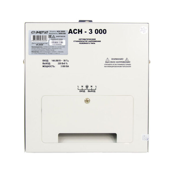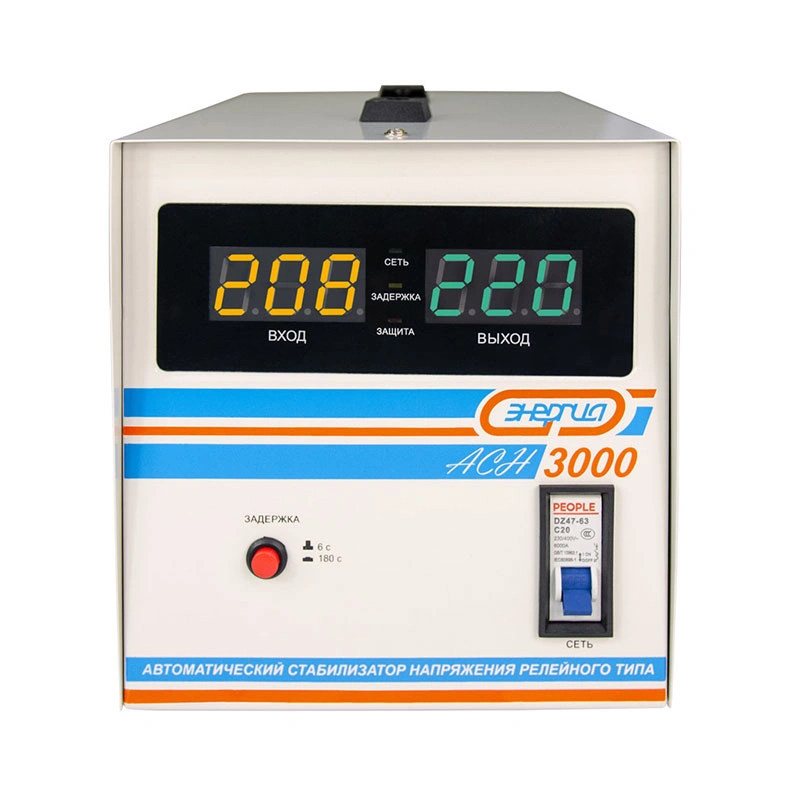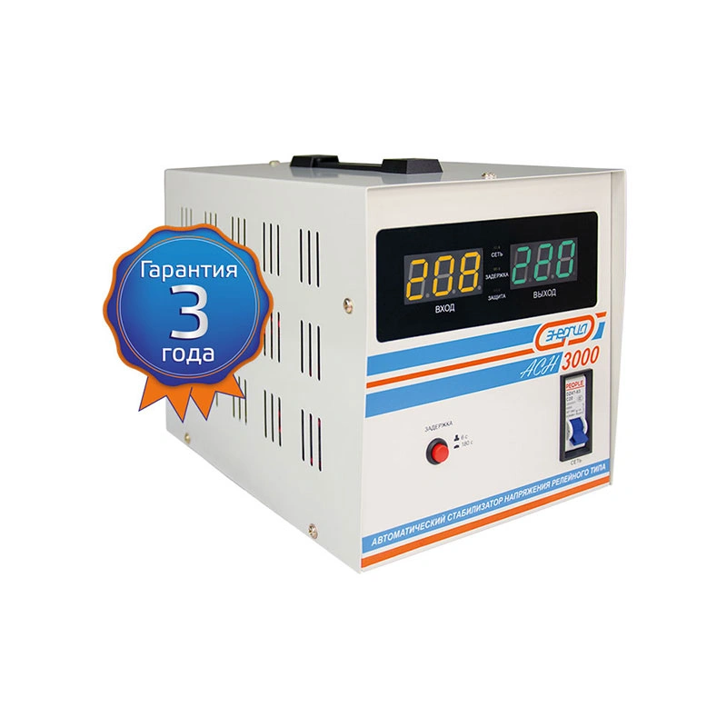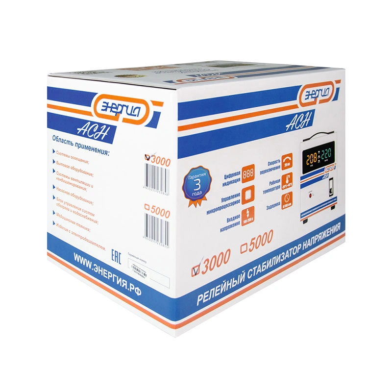 Релейный однофазный стабилизатор напряжения переменного тока предназначен для стабилизации переменного напряжения в сети электроснабжения для потребителей бытового и аналогичного назначения. Изделие относится к классу автотрансформаторных стабилизаторов со ступенчатым регулированием напряжения путем переключения отводов силового автотрансформатора с помощью электромеханических силовых реле, таким образом стабилизаторы Энергия АСН регулируют напряжение по релейному принципу.