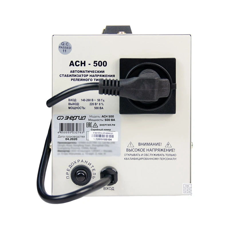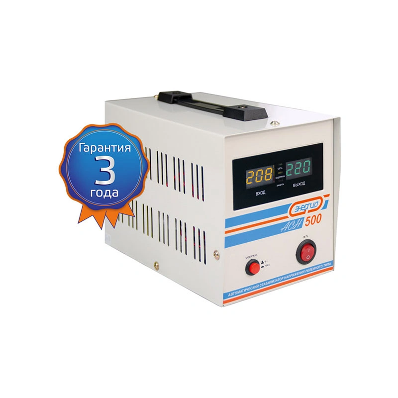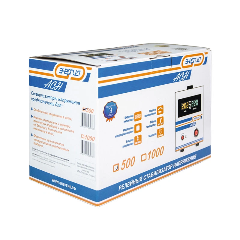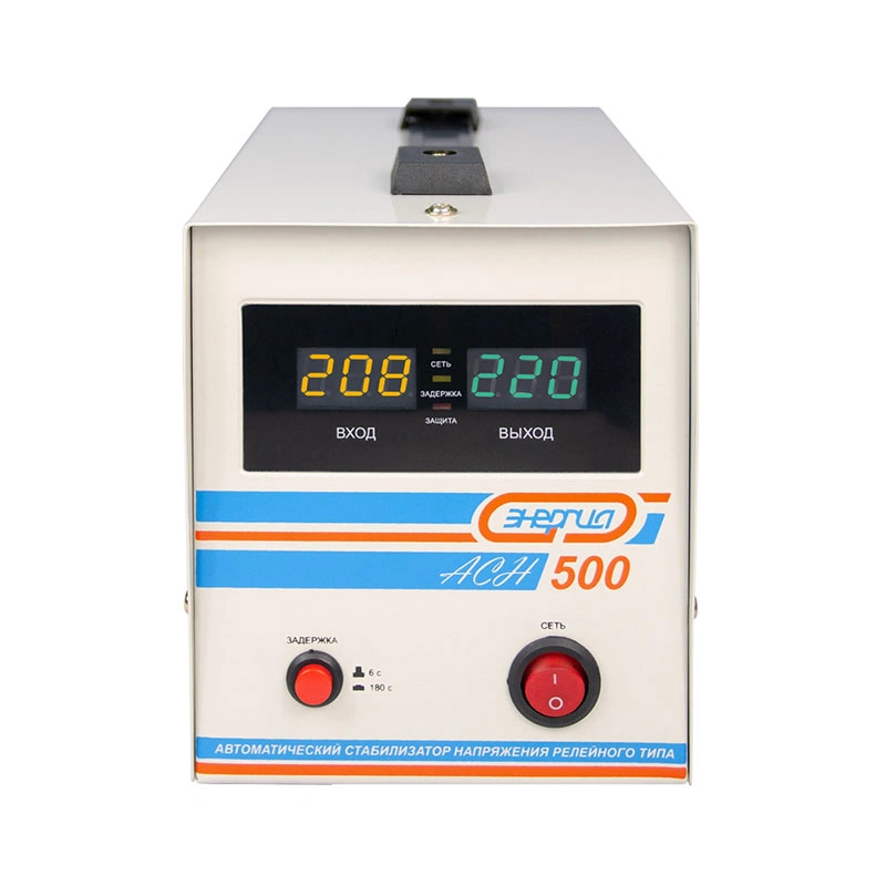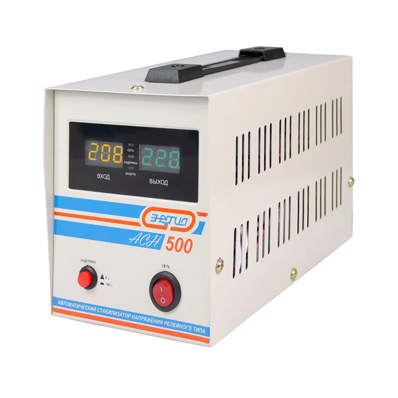 Стабилизатор напряжения «Энергия» АСН 500 доступное и надежное решение для тех, кто ищет качественный прибор по разумной цене. Стабилизатор релейного типа обеспечивает постоянное напряжение в 220 Вольт, надежно защищая домашнюю и офисную технику от скачков в электросети.