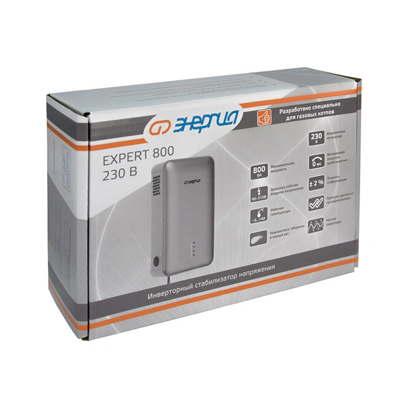 «Энергия Expert» 800 — это стабилизатор напряжения, оснащенный технологией двойного преобразования. Он обеспечивает идеальную синусоиду выходного тока с точностью до ±2%, что гарантирует стабильное и качественное питание для чувствительной техники, такой как компьютеры, медицинское оборудование, газовые котлы и системы связи.