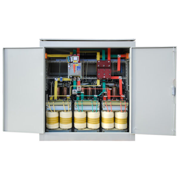 - Мощные компоненты: Установлен дополнительный трансформатор вольтодобавки с двигателем повышенной мощности, а внутренние соединения выполнены проводами увеличенного сечения для работы с высокими токами.