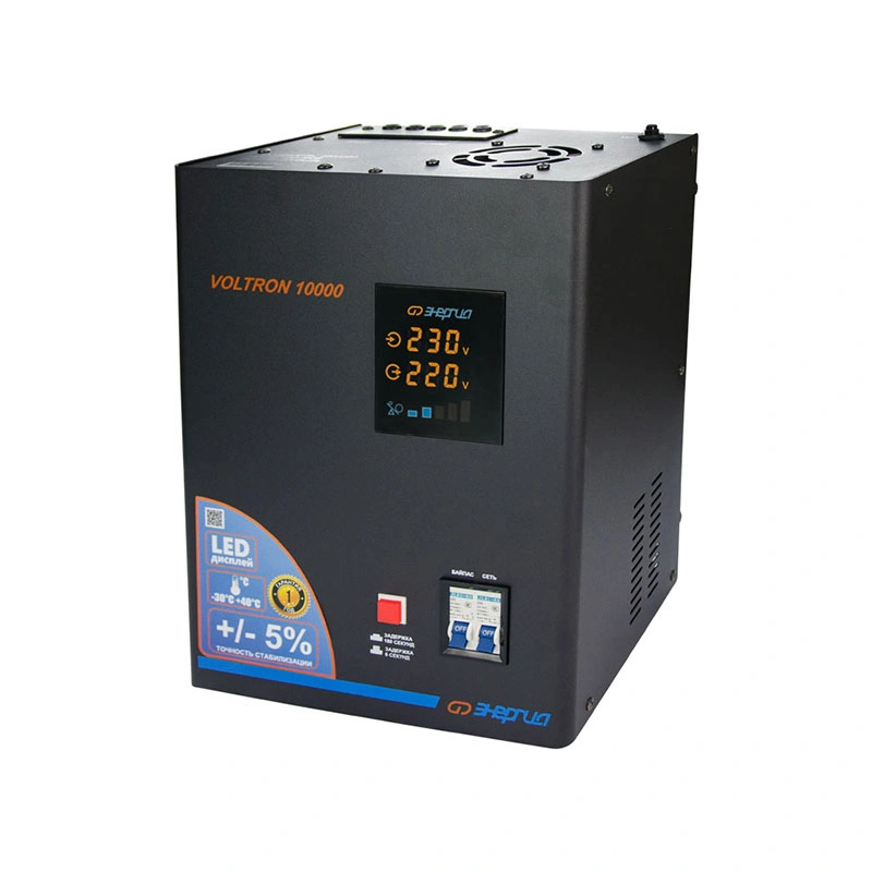 Установка и управление стабилизаторами Voltron просты и интуитивно понятны, что делает их доступными для пользователей с минимальным уровнем технической подготовки. Цифровой дисплей позволяет отслеживать текущие параметры сети и контролировать работу устройства в режиме реального времени. Конструкция предусматривает универсальный настенный или напольный монтаж. Металлический корпус выполняет не только защитную функцию, но и способствует эффективному теплоотводу.
