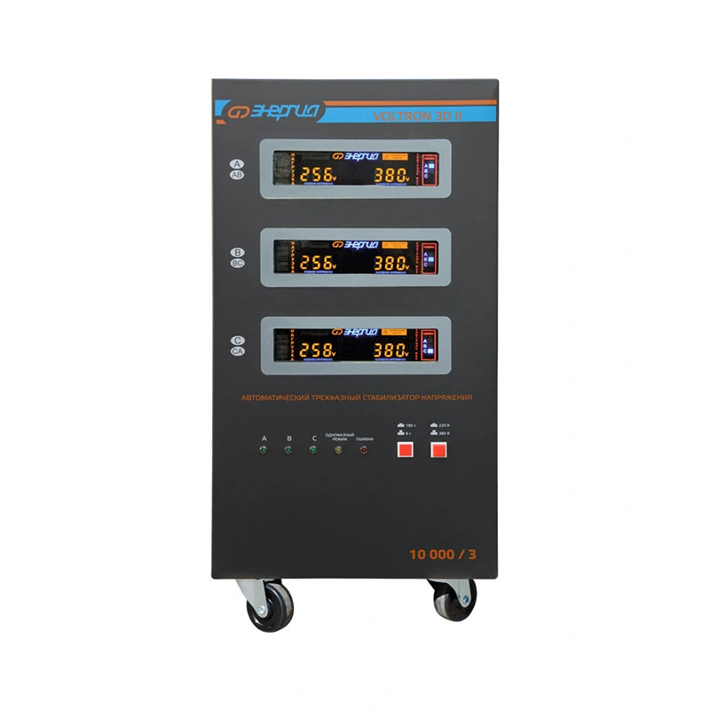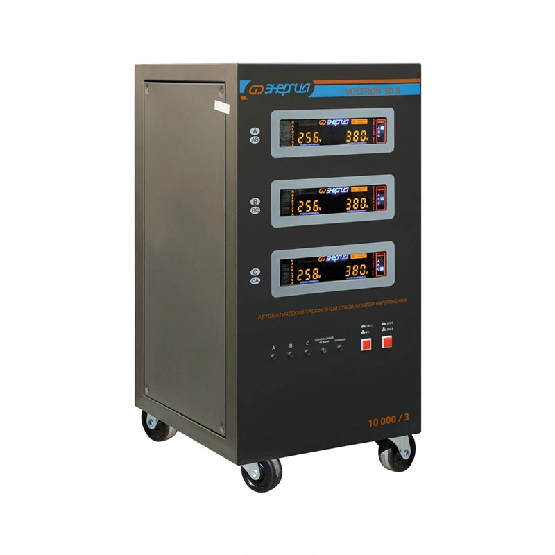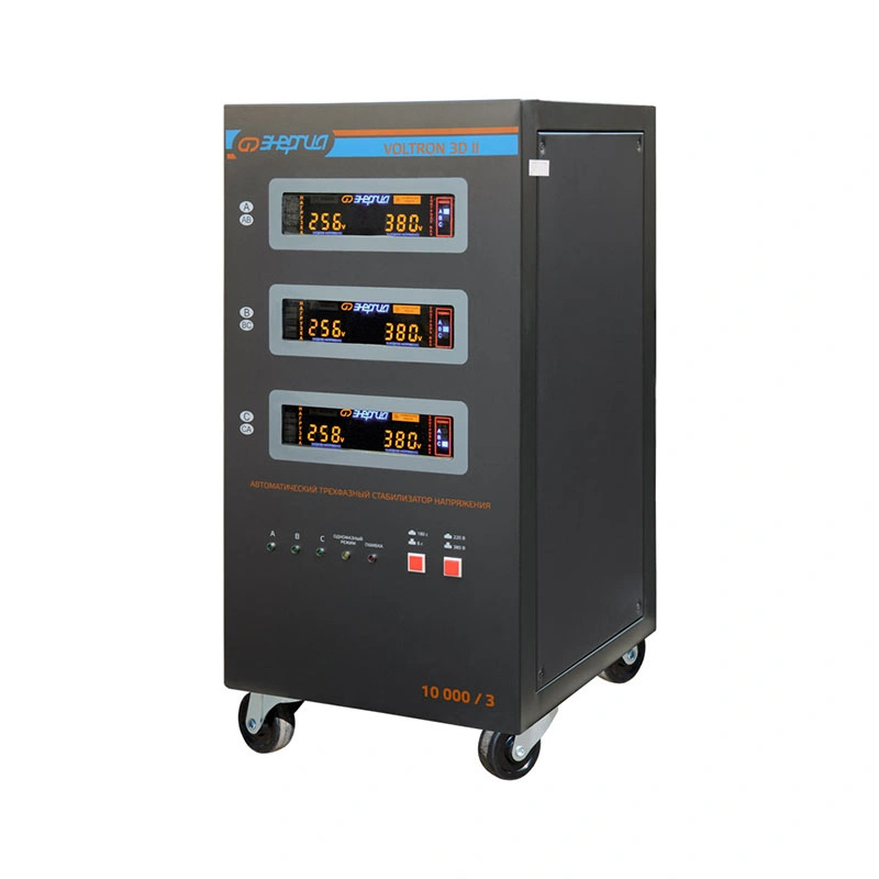 Трехфазный стабилизатор Энергия VOLTRON 3D предназначен для защиты критически важного промышленного оборудования в сетях с напряжением 380 В. Прибор позволяет поддерживать выходное напряжение с точностью ±3% независимо от значительных колебаний во входной сети. Это достигается благодаря электромеханическому принципу коррекции: микропроцессорный контроллер анализирует параметры каждой фазы и управляет сервоприводами, которые плавно перемещают токосъёмные щётки по обмоткам автотрансформатора. Подобная схема обеспечивает независимую коррекцию для каждой фазы, гарантируя стабильные 220/380 В на выходе даже при сильных просадках или превышениях напряжения.